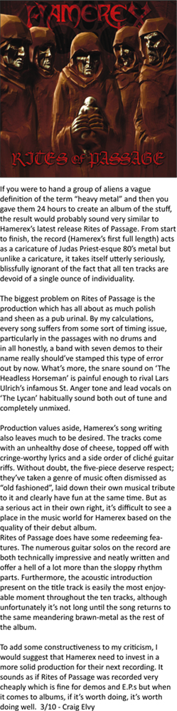 Rites of Passage Review (Wasted Magazine) Posted on September 22, 2012January 23, 2015 by Steve Posted in CD Reviews, ReviewsTagged Hamerex, Review, Rites of Passage, Wasted Magazine Wasted Magazine Source Share this: Click to share on Facebook (Opens in new window) Facebook Click to share on X (Opens in new window) X Like Loading... Related